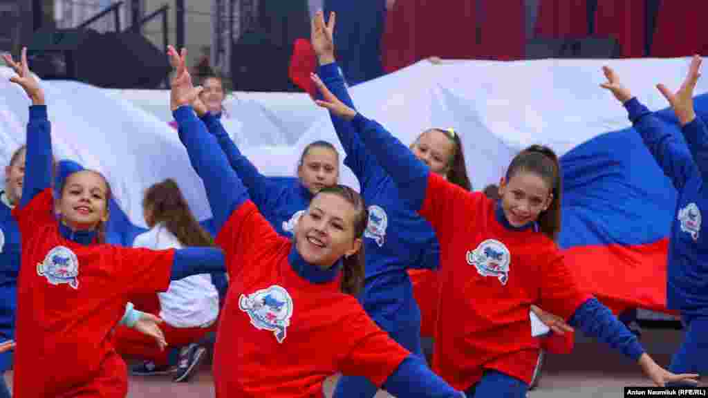 В Симферополе празднования начались на площади Ленина, где были организованы палатки с товарами ручной работы и блюдами национальной кухни. На площади флагов и символики партии «Единая Россия» было больше, чем российских флагов. На сцене выступали детские коллективы, милитаризованные организации «патриотического воспитания молодежи».
