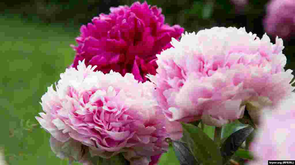 В Симферополе в ботаническом саду ТНУ им. Вернадского цветут белые, розовые и красные пионы. Горожане и гости города пришли полюбоваться цветами и сфотографироваться с ними.
