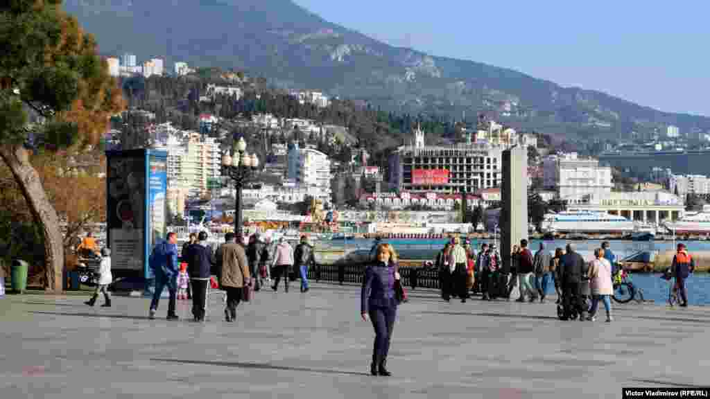 Ялта, как и прежде, притягивает отдыхающих со всех уголков Крыма, материковой Украины и стран СНГ. Тихий, размеренный темп жизни и никуда не спешащие люди – в этом одна из главных особенностей южнобережного города. Прогуляться по Набережной – обязательный пункт в программе каждого, кто посетит летнюю столицу полуострова. Зимой людей здесь мало. Впрочем, это характерно для любого приморского города полуострова.