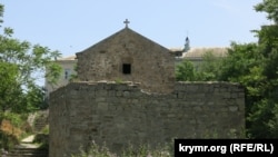 Если подняться выше, на Карантинский холм, то видна церковь св. Стефана. Она кажется очень похожей на армянскую – и внешне, и по кресту, но нет, это греческая церковь, ее тоже относят к XIV веку. Постройка отличается строгостью архитектуры и традиционно скромными размерами. Чтоб вы даже не сомневались, ее тоже захватила РПЦ, навесив на вход в церковь замок и добавив табличку, что это теперь ее владения.