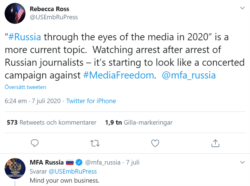Ребекка Росс @USEmbRuPress: «#Россия глазами СМИ в 2020 году» – это более актуальная тема. Наблюдая за следующими один за другим арестами российских журналистов, начинает казаться, что это согласованная кампания против #MediaFreedom (свободы прессы). @mfa_russia