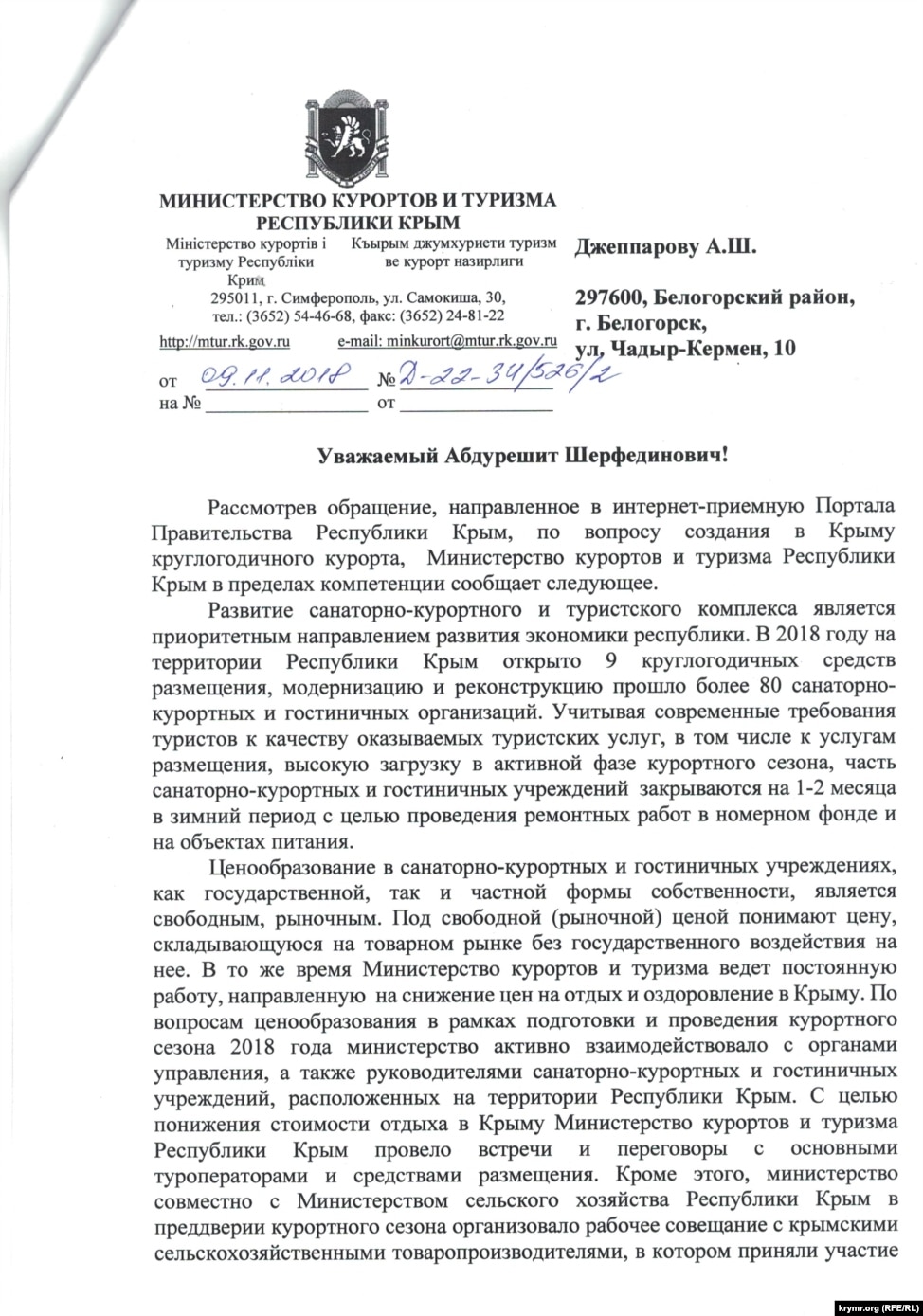 «Развитие санаторно-курортного и туристского комплекса является приоритетным направлением развития экономики республики. В 2018 году на территории Республики Крым открыто 9 круглогодичных средств размещения, модернизацию и реконструкцию прошло более 80 санаторно-курортных и гостиничных организаций. Учитывая современные требования туристов к качеству оказываемых туристических услуг, в том числе к услугам размещения, высокую загрузку в активной фазе курортного сезона, часть санаторно-курортных и гостиничных учреждений закрываются на 1-2 месяца в зимний период с целью проведения ремонтных работ в номерном фонде и на объектах питания», – сообщается в письме российского Министерства курортов и туризма Крыма, которым обладают Крым.Реалии.