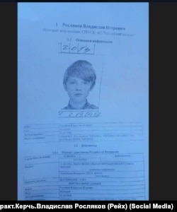 «ВКонтакте», например, создана специальная группа «Теракт.Керчь.Владислав Росляков (Рейх)», в которой публикуются документы, связанные с погибшим. Там обнародована выписка из паспорта Рослякова, согласно которой парень родился 2 мая 2000 года в Керчи, а в 2014 году ему был выдан российский паспорт в связи с достижением 14 лет.