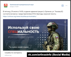 Тем временем, в 810-ю бригаду пытаются вербовать контрактников. Вот такая встреча, например, была анонсирована в селе Орлиное, под Севастополем. А на сайте населенного пункта разместили рекламу контрактной службы.