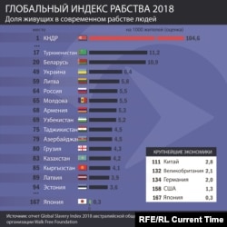 По подсчетам ООН, Россия входит первую в десятку стран по числу рабов – подневольным трудом в регионе занимаются 794 тысячи человек. Лишь в Индии, Китае, Северной Корее, Пакистане, Иране, Конго, Нигерии и Индонезии количество рабов формально больше российского. В среднем на тысячу человек населения в России 5,5 человек находятся в рабстве – трудовом или сексуальном. Если сравнивать с соседями, то в Беларуси на тысячу граждан приходится 10,9 рабов, а в Украине – 6,4 раба.