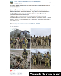 В середине января в социальной сети "ВКонтакте" от имени профиля "Газета "Спецназ России" и журнал "Разведчикъ" были опубликованы фотографии, на которых якобы запечатлены сербы, прибывшие в Запорожскую область Украины из Белграда. В посте утверждалось, что они "входят в состав добровольческого батальона имени Павла Судоплатова". Он был создан, предположительно, осенью 2022 года в оккупированной Россией части Запорожской области и назван в честь сотрудника советских спецслужб, диверсанта, сотрудника ОГПУ-НКВД и организатора убийства Льва Троцкого. Приводятся также слова назначенного Россией "главы" частично оккупированной Запорожской области Украины Евгения Балицкого: он заявил, что "братья-сербы" не словом, а делом продемонстрировали свою верность России и готовы "сражаться с нацизмом" в Украине.