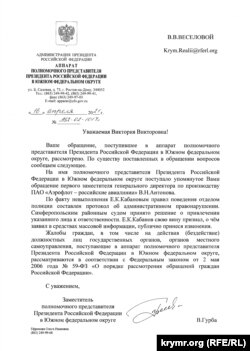 В то же время Крым.Реалии получили письмо из полномочного представительства президента России в Южном федеральном округе. В нем говорится, что на имя полпреда Владимира Устинова действительно поступало обращение от первого заместителя гендиректора ПАО «Аэрофлот» Владимира Антонова.