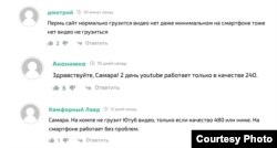 В комментариях россияне из разных регионов описывали проблемы с загрузкой видео. Так, пользователь из Перми сообщил, что сам сайт YouTube у него работает, но видео не загружаются даже в низком качестве ни в десктопной версии, ни в мобильной. Пользователь из Кирова рассказал, что ролики не успевают прогружаться, часто останавливаются и не загружаются дальше.